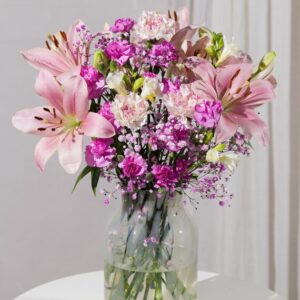 A feminine selection of pale pink Asiatic Lilies alongside hot pink spray Carnations, pink and white two tone Carnations and white Freesias. Beautifully finished with sweet pink Gypsophila, it will make a gorgeous gift to send for any special occasion.