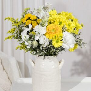 Welcome warmer days with this bright spring bouquet of Chrysanthemums, Lisianthus, Germini and Carnation. Bright yellows and fresh whites create a radiant display that’s perfect for all occasions